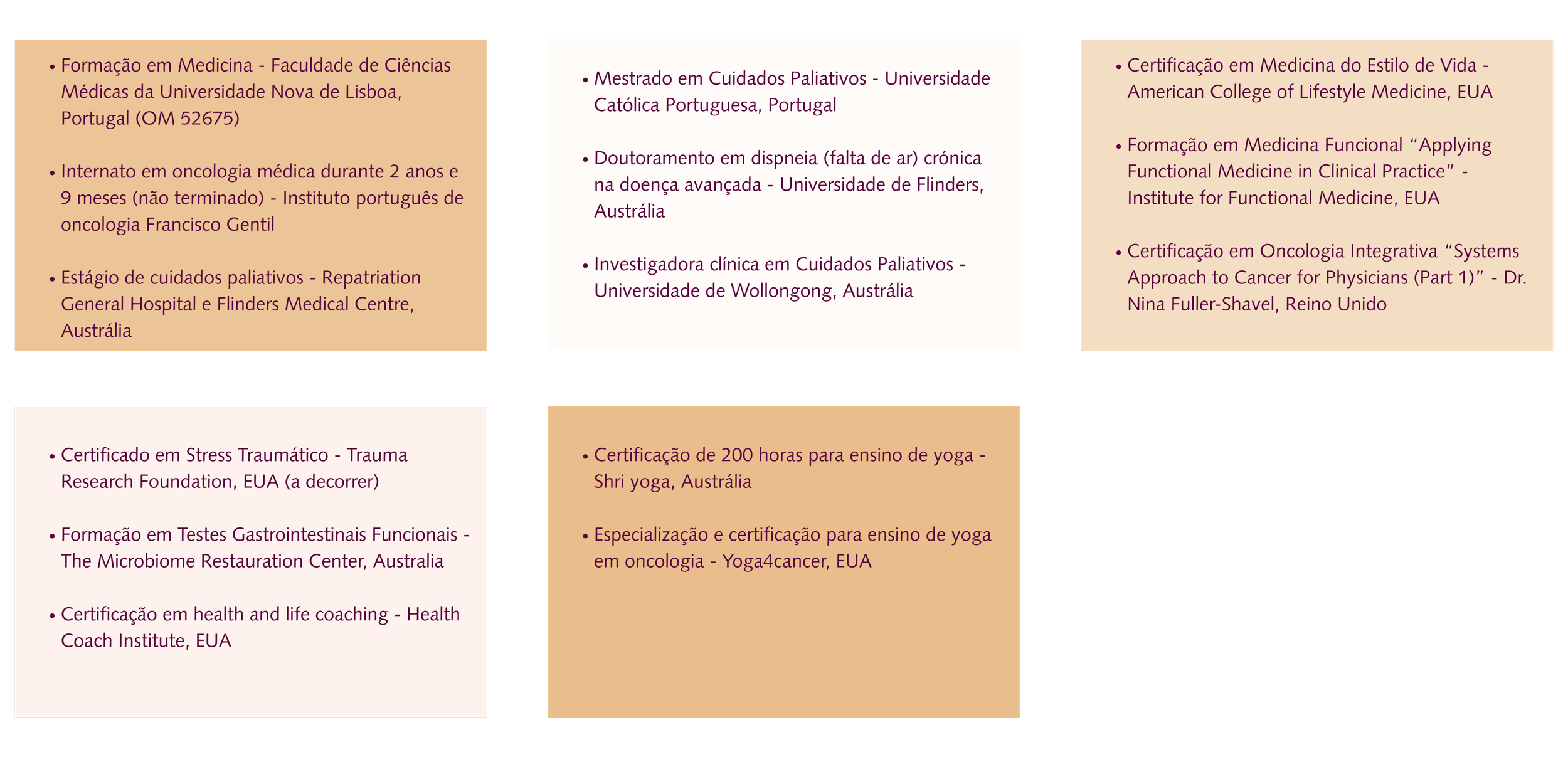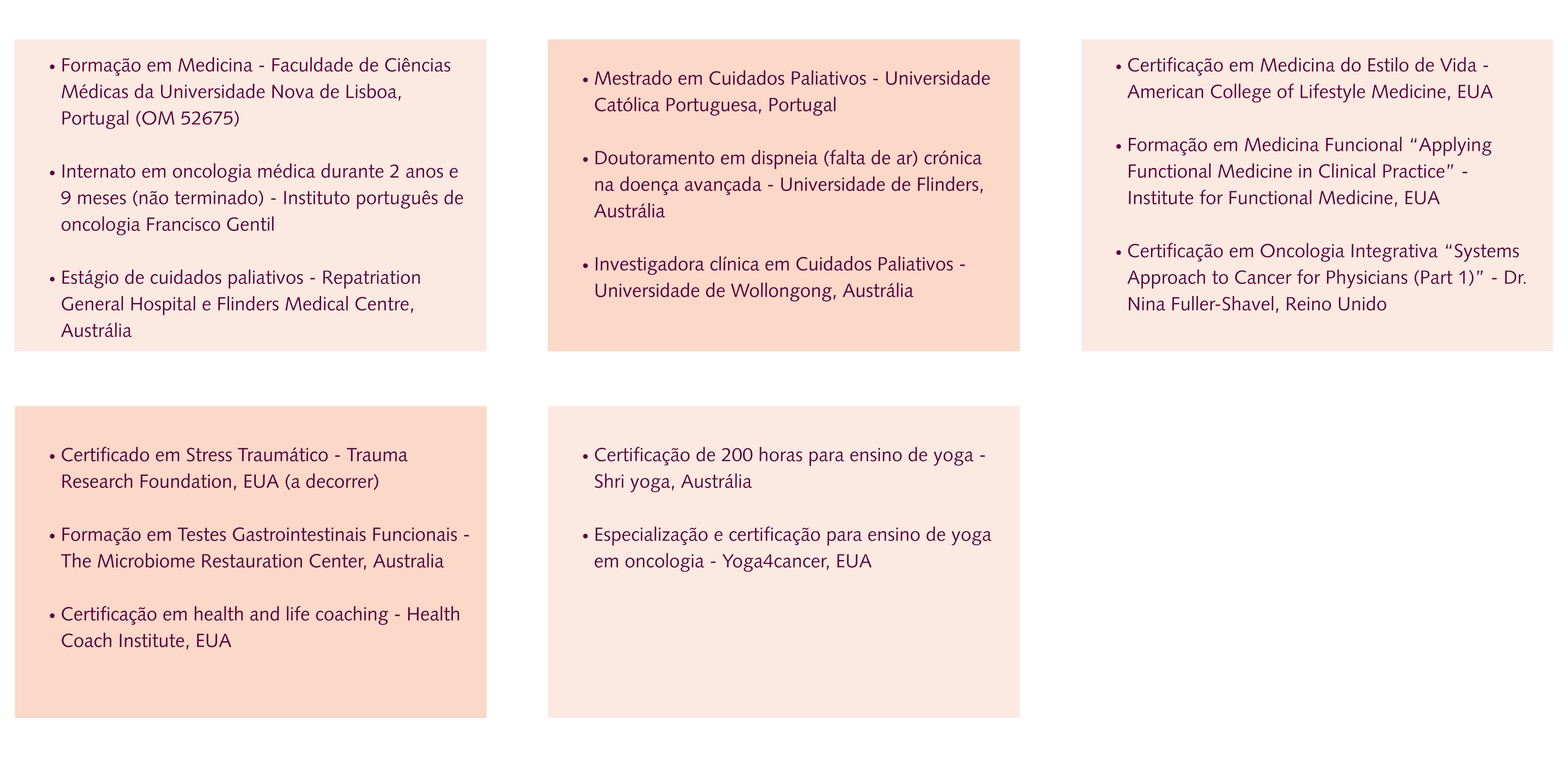 Em 2020, a vivência pessoal de uma doença oncológica reforçou este caminho e motivou-me a aprofundar áreas da medicina e da saúde centradas na totalidade da pessoa. Desde então, adquiri formação em medicina do estilo de vida, medicina integrativa e funcional, regulação do sistema nervoso, microbioma, coaching de saúde e yoga em oncologia, integrando estas ferramentas na prática clínica.